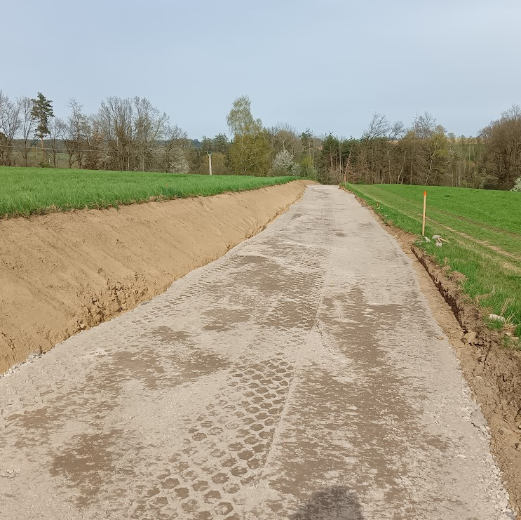 8.4.24:výstavba pokračuje...pro mě trochu chaoticky - cesta z Klanečné se dělá, ale jen k lesu...čekal bych, že se začne od potoka do Klanečné, ale asi je to vymyšleno nějak jinak....